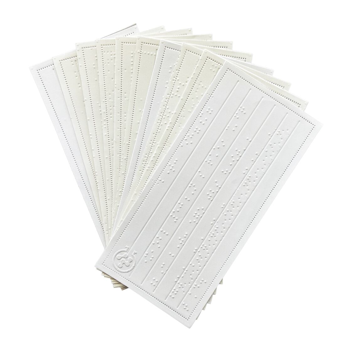 点字の凹凸は予め潰す加工をしておりますが、細いペン先は引っかかってしまう場合がございますので、サインペンなどの使用をお勧めいたします。